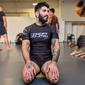 the "Master Your CNCPT" white short sleeve rash guard. Crafted for champions, this sleek design embodies strength and sophistication. Made from high-quality 240 GSM polyester and spandex material, this premium rash guard ensures durability, flexibility, and maximum comfort during every move.